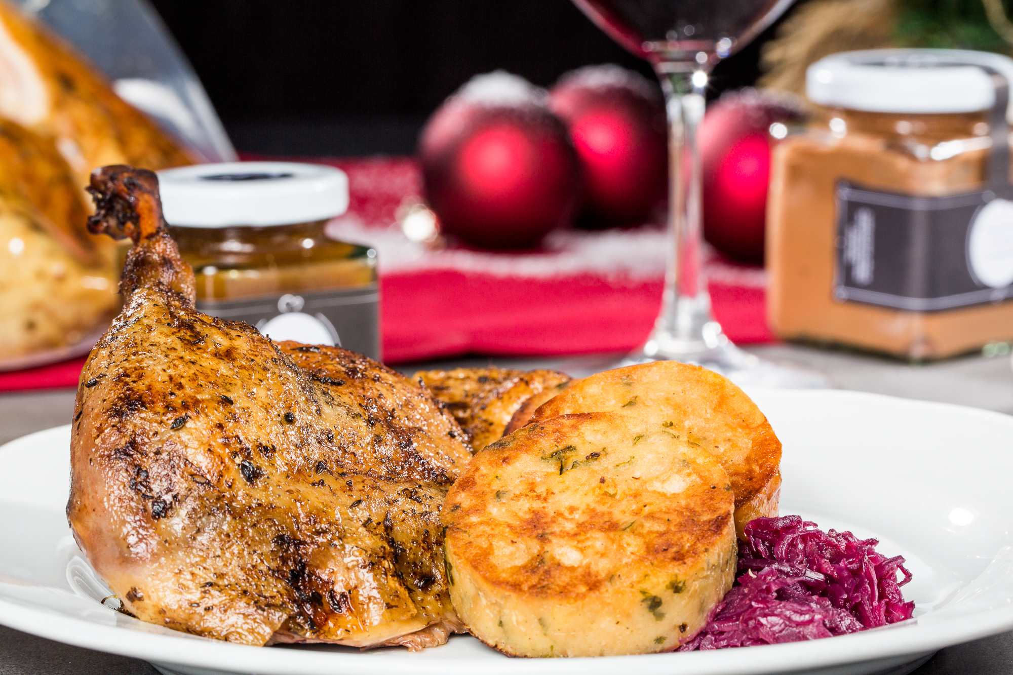 Halbe gebratene Bauernente mit aromatischer Soße, Blaukraut und Semmeltalern