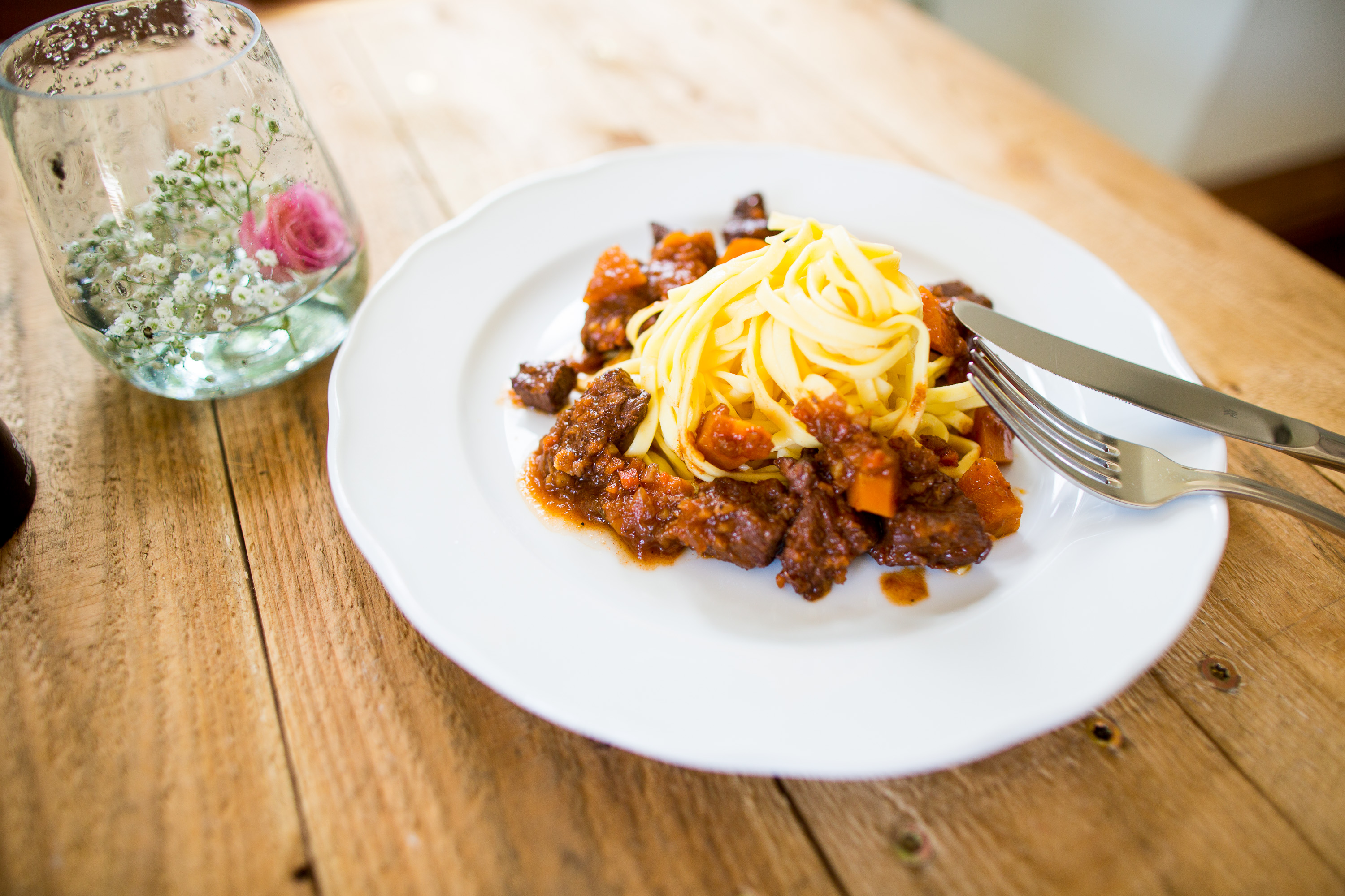 Schonend gegartes Kalbsragout an frischen Bandnudeln.