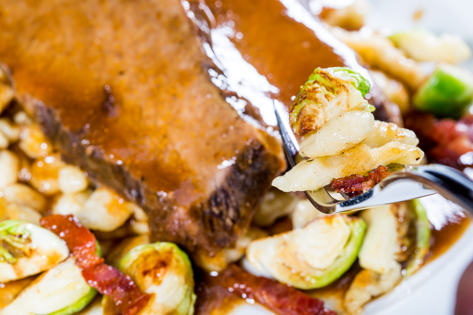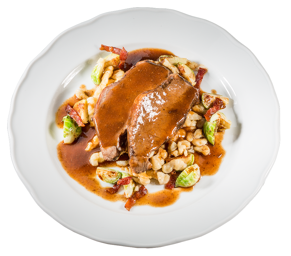Freuen Sie sich auf ein leckeres Wildgericht. Das Rosenkohl-Speckgemüse harmoniert perfekt zum Rehbraten und unseren hausgemachten Spätzle.