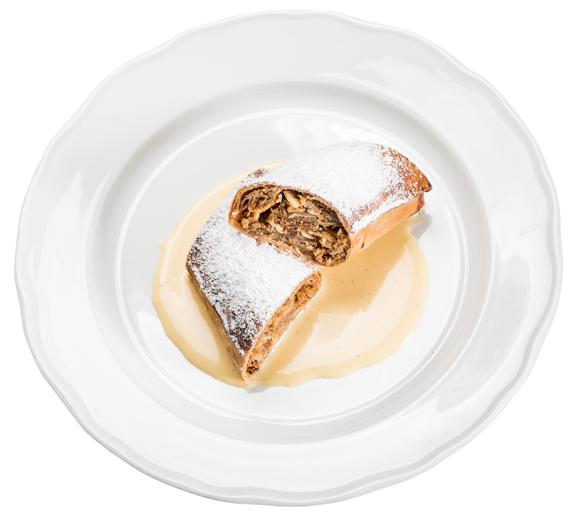 Apfelstrudel: Äpfel, Rosinen, Weizenmehl, Mandeln, Haselnuss, Zucker, Strohrum (enhält Alkohol), Ei, Orangen- und Zitronenabrieb, Gewürze