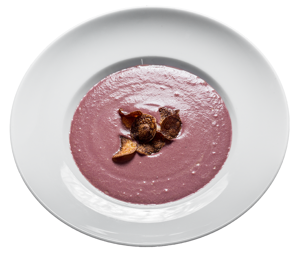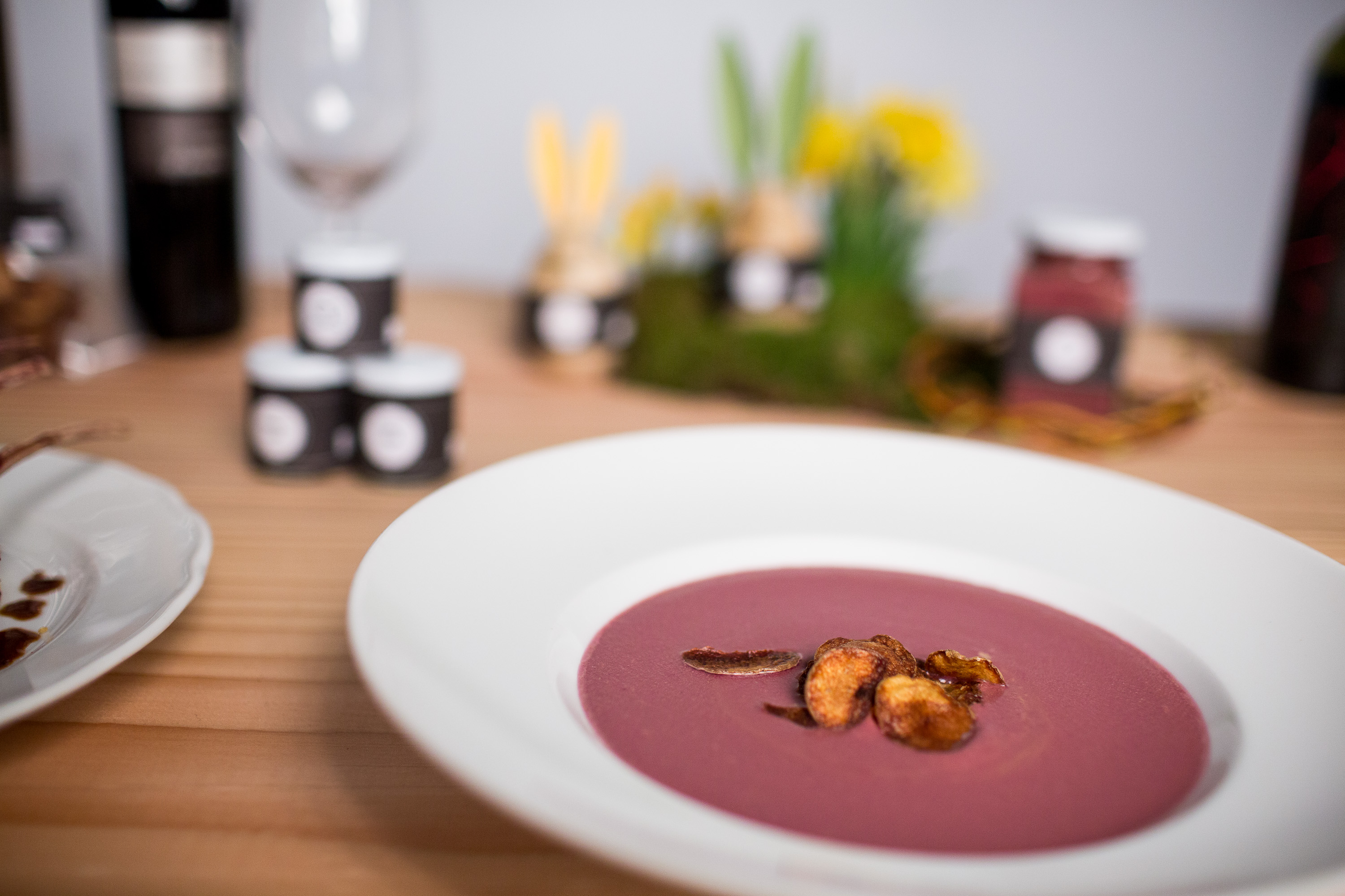 Suppe: Trinkwasser, lila Karotten, Sellerie, Zwiebel, schwarzer Johannisbeersaft (Trinkwasser, Johannisbeersaft, Zucker), Butter, Zucker, Kräuter und Gewürze