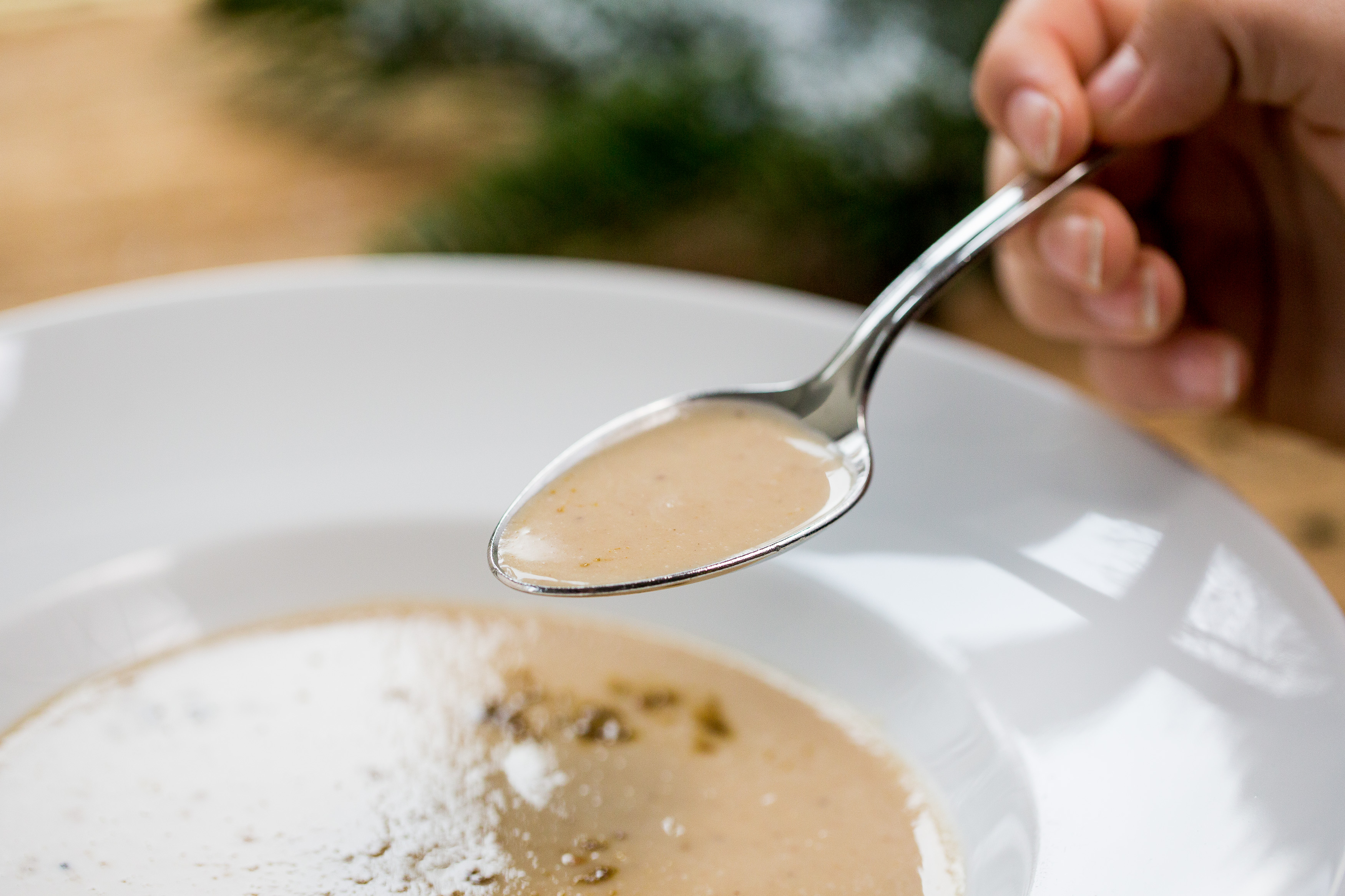 Maronensuppe: Maronen, Zwiebel, Weißwein (enthält Sulfite) Apfelsaft, Sahne, Knoblauch, Kräuter und Gewürze
